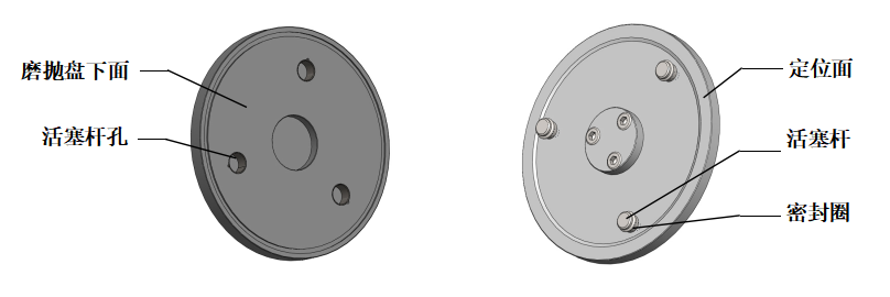 01  磨拋盤可快速更換,兩手拿住磨拋盤輕輕上提即可取下來;將另一個磨拋盤兩手拿平,目測磨拋盤的三個活塞桿孔與三個活塞桿基本對應時落下,感覺其中一個孔對應時,輕微擺動磨拋盤使另兩個也對應后將盤持平插入,再用手控壓一下,使磨拋盤下面與磨拋座的定位面完全接觸。